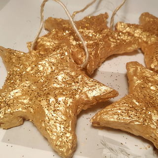 Primero dibujaremos nuestras estrellas sobre el cartón, necesitaremos mínimo 5 por adorno y las recortaremos. Para darle grosor a nuestra estrella le daremos varias capas de estrellas de cartón pegado con pegamento de barra entre las dos estrellas, es decir, iremos añadiendo capas de cartón entre medias para engordarla. Después le daremos una primera capa con cinta de carrocero, alisando los costados.