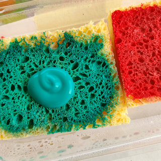 En nuestros contenedores de plástico recortaremos las esponjas y las pondremos en su interior. Después añadiremos el color acrílico que queramos y mojaremos muy bien la esponja, tiene que estar bastante empapada. Y ya podemos estampar...mojamos en la esponja y estampamos en nuestro papel....y a crear!!